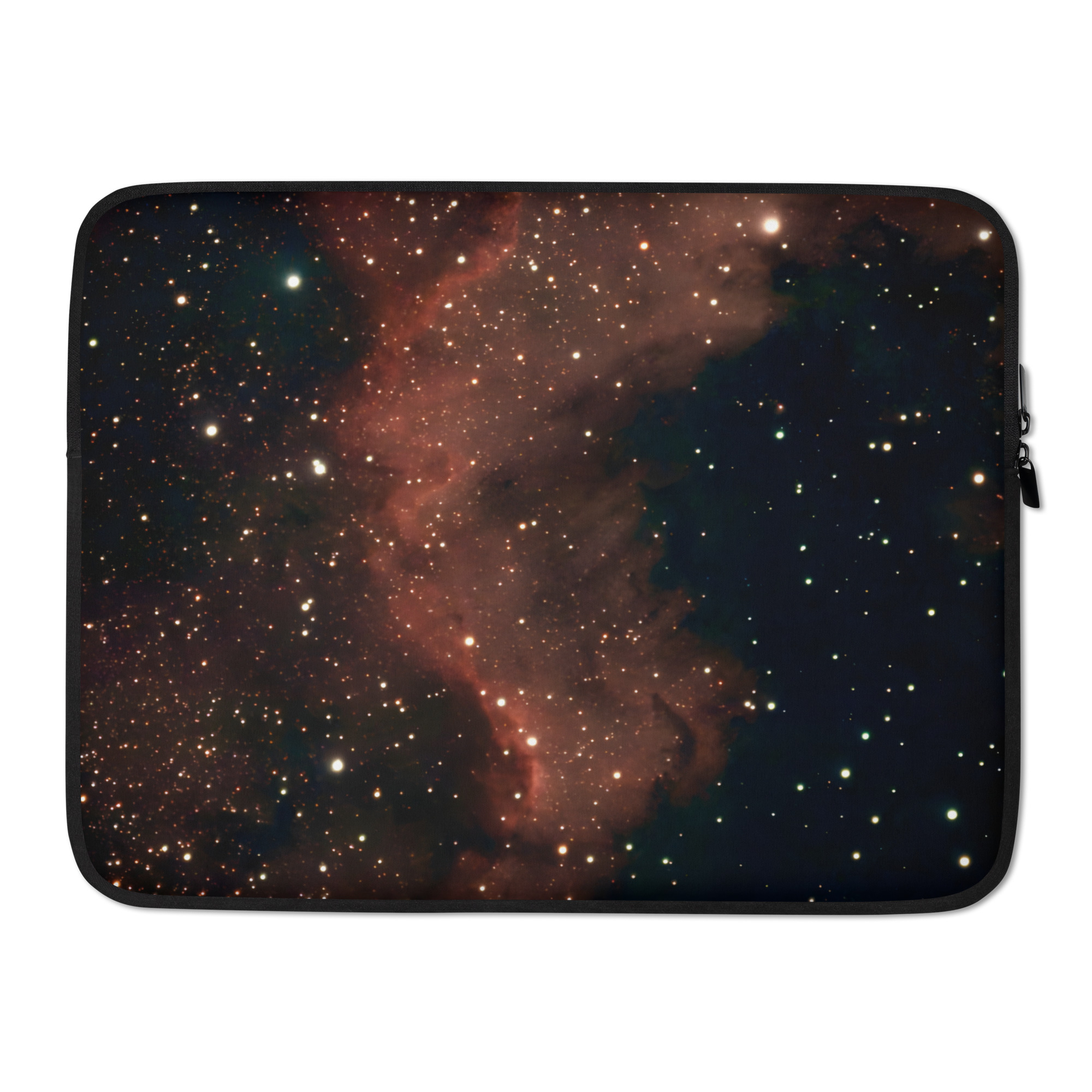 Protect your tech in cosmic style with this laptop sleeve featuring the North America Nebula (NGC 7000) — a magnificent emission nebula in the constellation Cygnus, about 2,500 light-years away. The deep red and gold tones of glowing hydrogen clouds form a celestial landscape reminiscent of North America. Captured from the night skies of Tallinn, Estonia, this sleeve combines practical protection with a touch of the Universe.