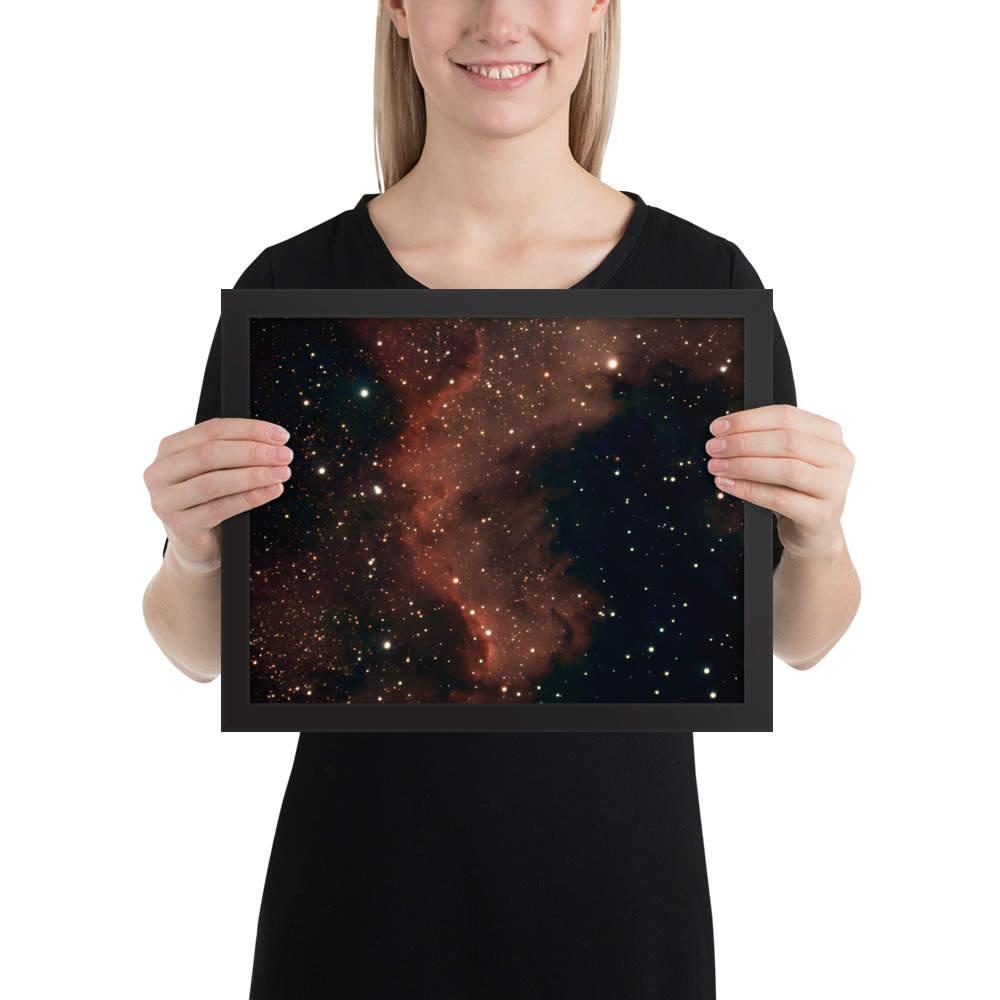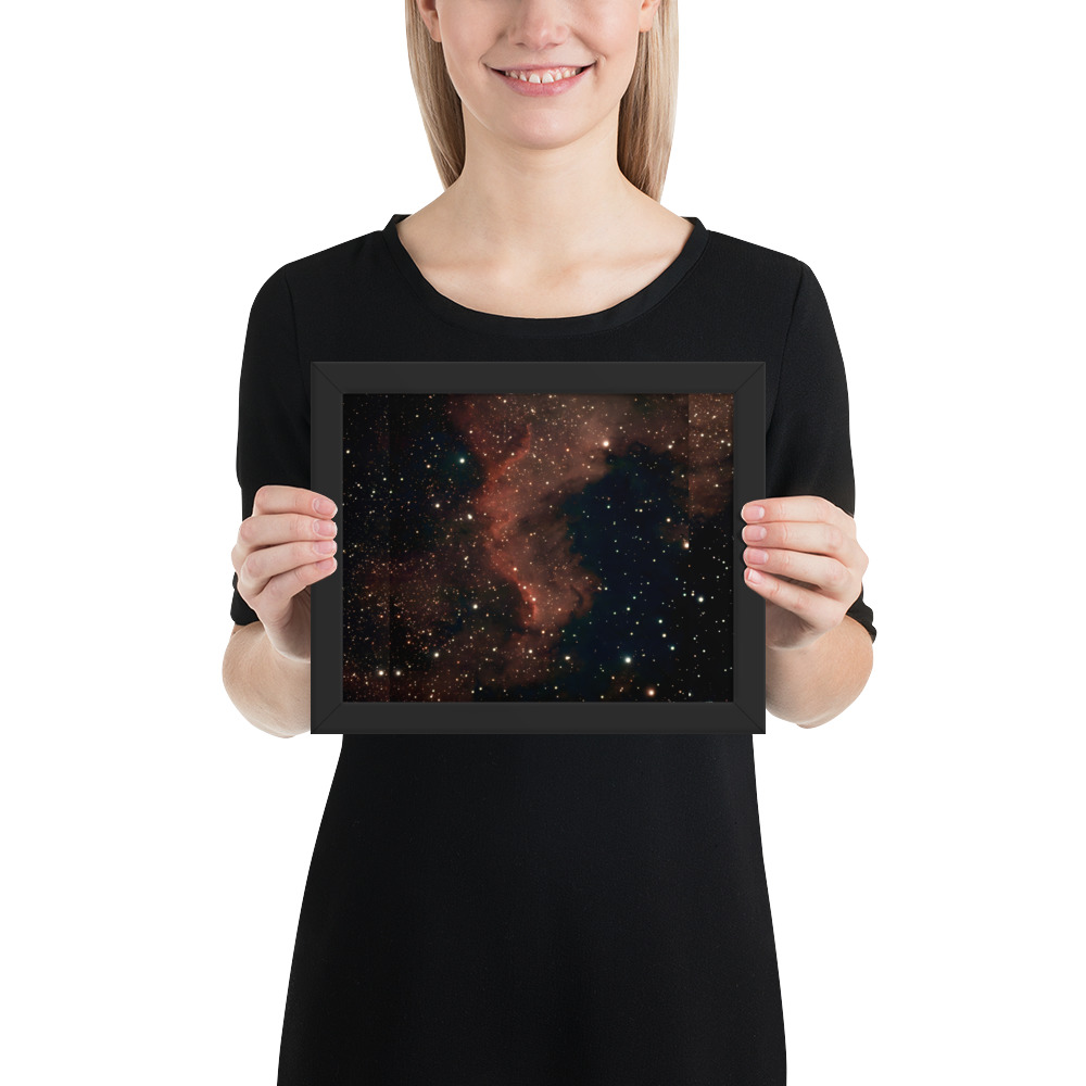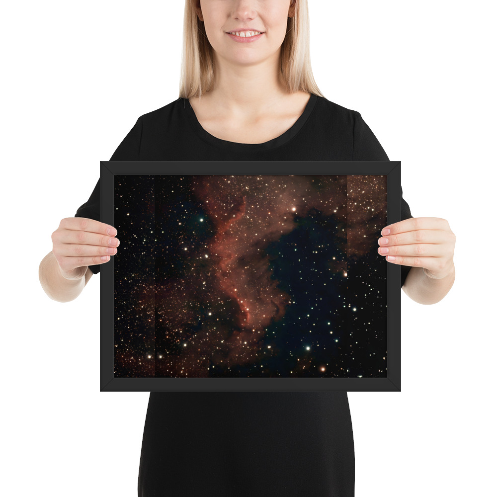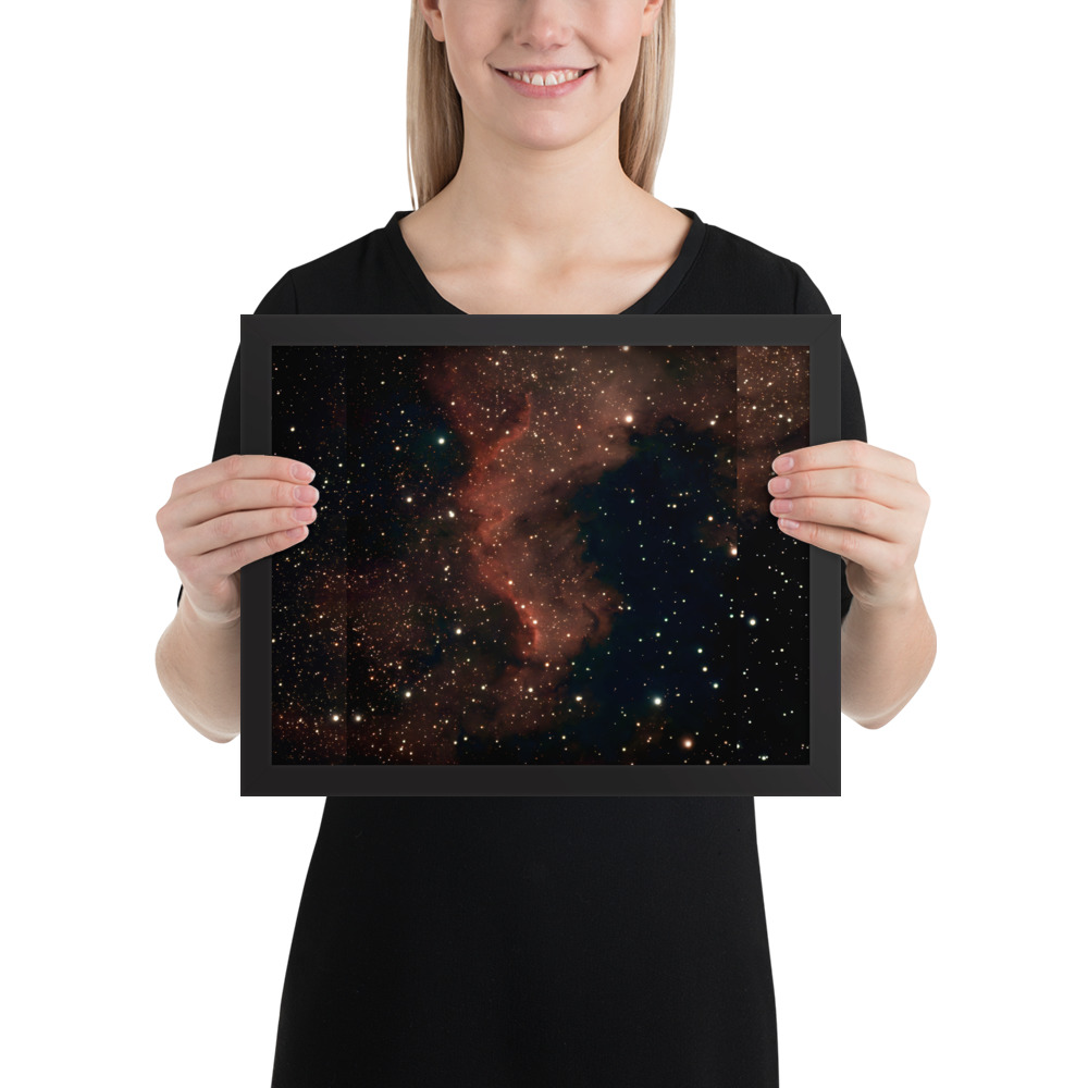 Capture the beauty of the cosmos with this stunning image of the North America Nebula (NGC 7000) — a vast emission nebula located in the constellation Cygnus, around 2,500 light-years from Earth. The rich red and gold hues come from glowing hydrogen clouds shaped by interstellar winds, forming a celestial landscape that resembles the North American continent. Photographed from the night skies of Tallinn, Estonia, this print reveals the delicate balance between cosmic chaos and harmony — a real fragment of the Universe brought into your home.